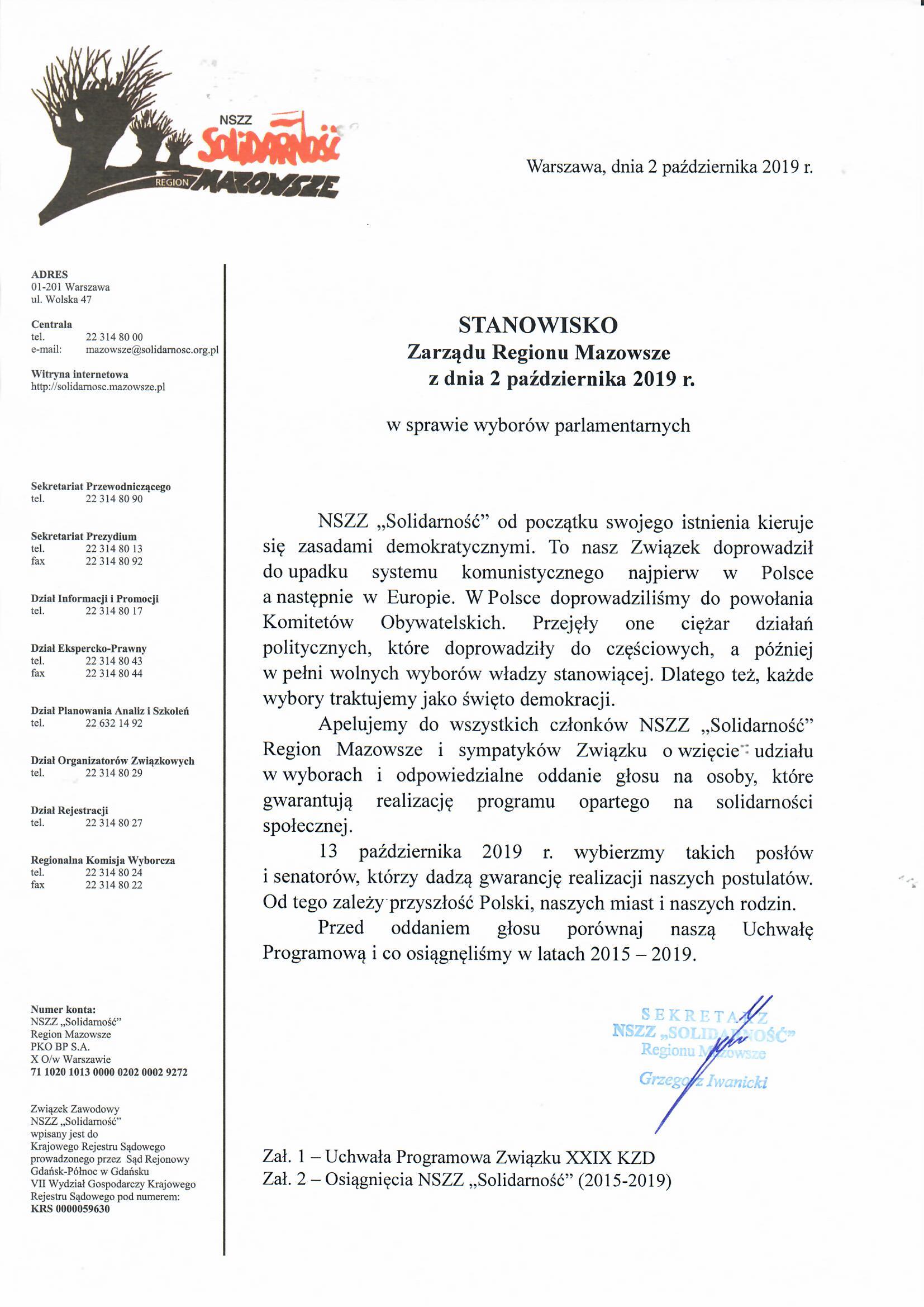 Zarządu Regionu Mazowsze z dnia 2 października 2019 r.