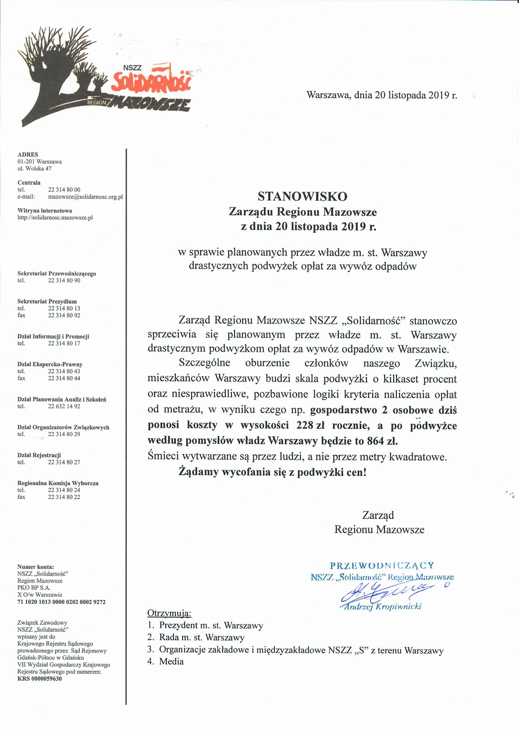 Stanowisko Zarządu Regionu Mazowsze ws. planowanych przez władze m. st. Warszawy drastycznych podwyżek opłat za wywóz odpadów 20 listopada 2019 maja Aktualności, Slider 0 stanowisko w sprawie podwyzki oplat