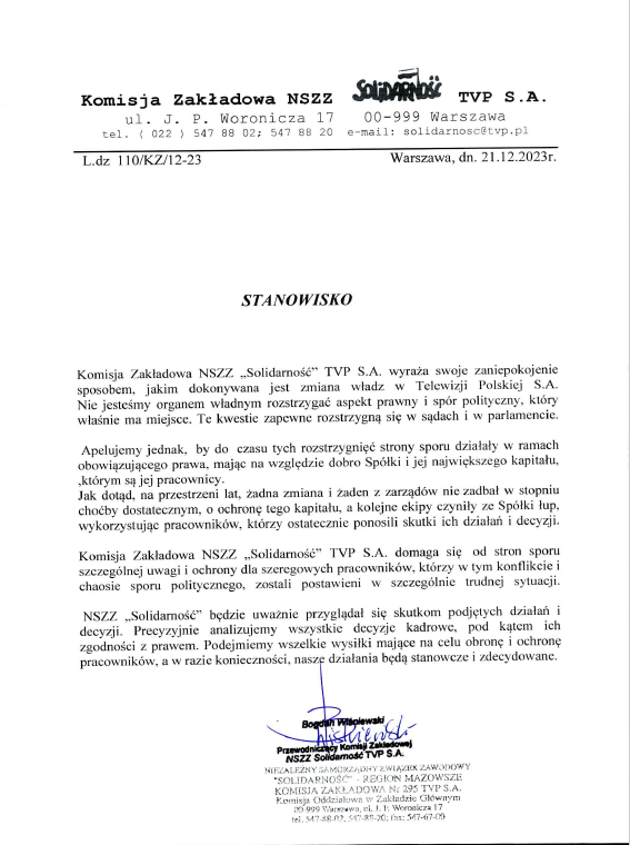 Stanowisko Komisji Zakładowej NSZZ „Solidarność” TVP S. A. 22 grudnia 2023 Małgorzata Aktualności, Slider 0