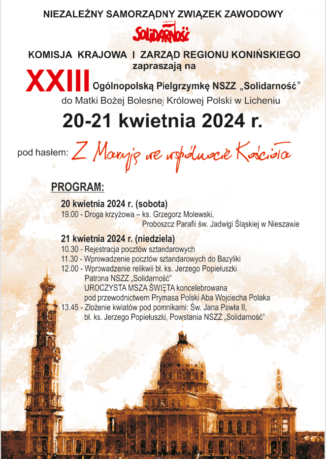 Komisja Krajowa NSZZ „Solidarność” i Zarząd Regionu Konińskiego zaprasza na XXIII Ogólnopolską Pielgrzymkę NSZZ „Solidarność” do Matki Bożej Bolesnej Królowej Polski w Licheniu w dniach 20-21 kwietnia br.