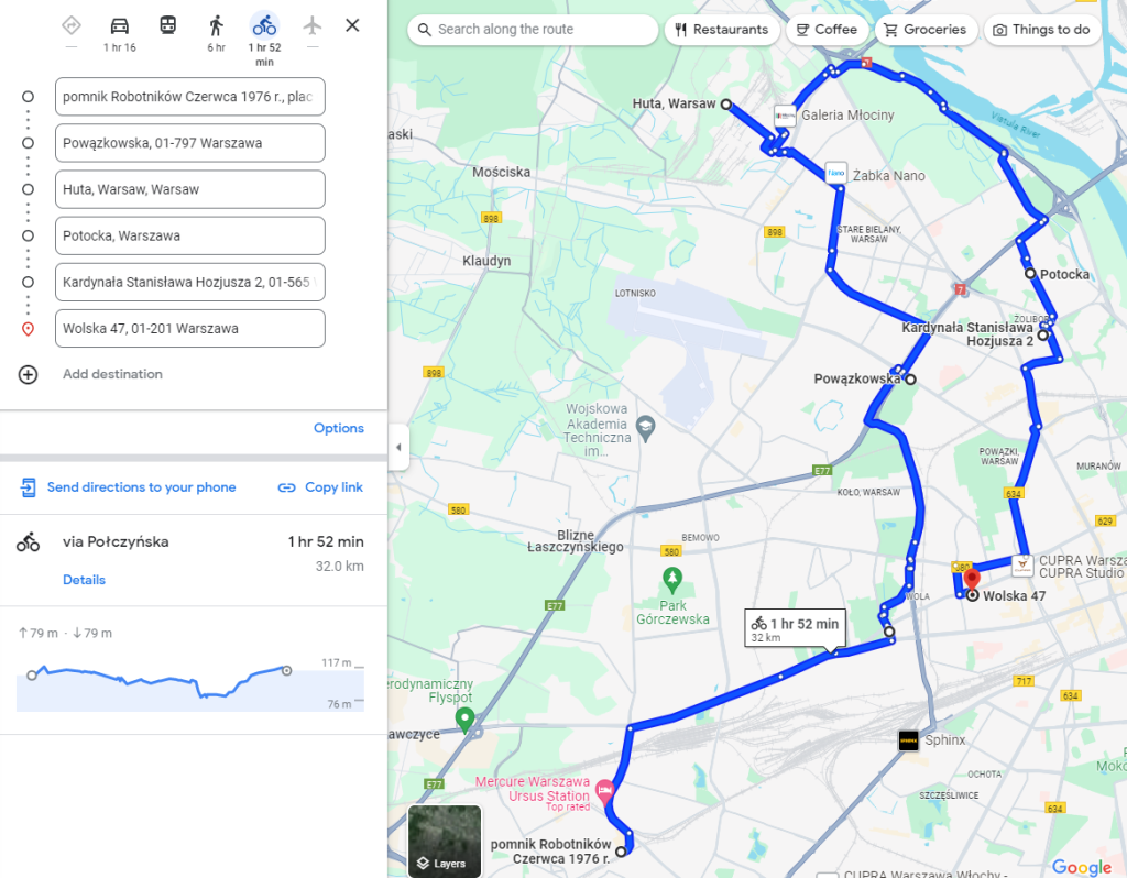 Trasa będzie przebiegać po ścieżkach rowerowych, będą dwa podjazdy w ramach pierwszego odcinka Ursus – Powązki Wojskowe). Ocena trasy: łatwa