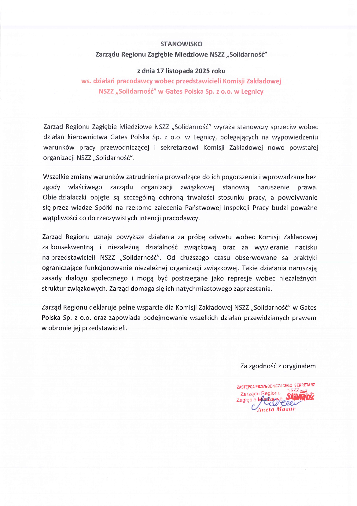 Stanowisko Zarządu Regionu Zagłębie Miedziowe w obronie przedstawicieli Komisji Zakładowej NSZZ „Solidarność” w Gates Polska Sp. z o.o. 21 listopada 2025 Maria Aktualności, Slider 0