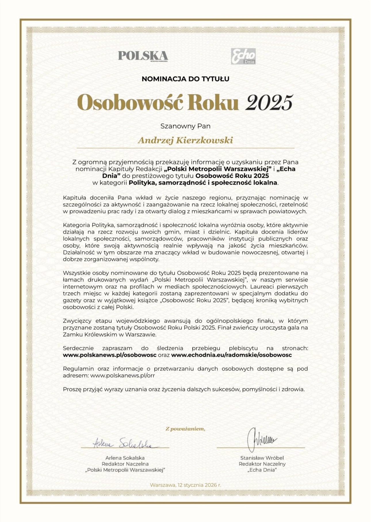 Jest nam niezmiernie miło poinformować, że nasz kolega Andrzej Kierzkowski – Przewodniczący z Ursusa otrzymał nominację do tytułu Osobowość Roku 2025.Plebiscyt organizowany jest przez Redakcję „Polski Metropolii Warszawskiej” i „Echa Dnia”.