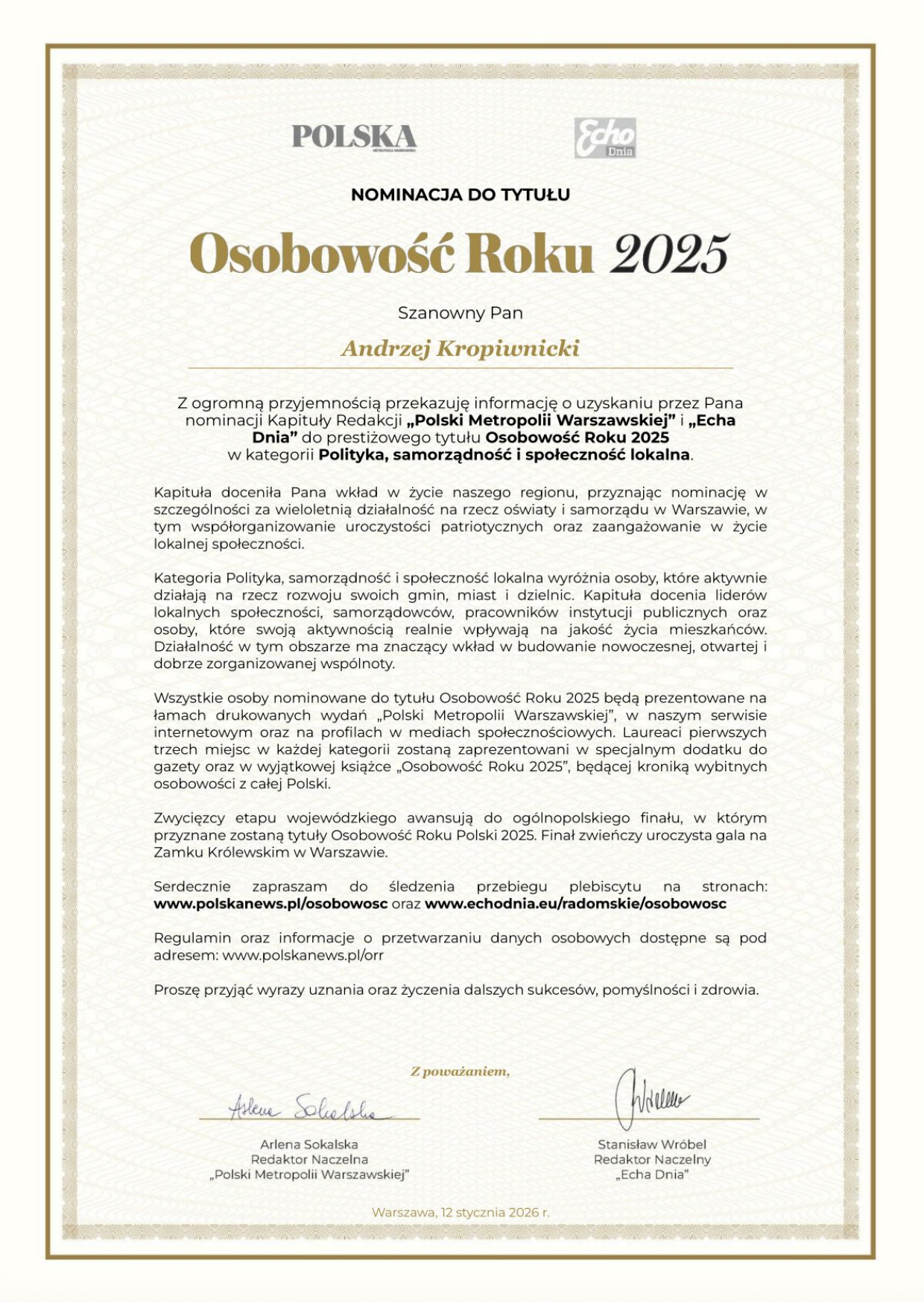 Kolejna wspaniała informacja dotarła do Regionu Mazowsze! Andrzej Kropiwnicki – wieloletni Przewodniczący Regionu Mazowsze, działacz związkowy i samorządowy, nauczyciel oraz honorowy obywatel miasta stołecznego Warszawy został nominowany do tytułu Osobowość Roku 2025.