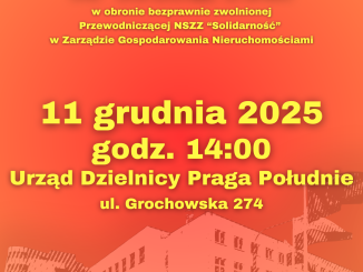 NSZZ „Solidarność” organizuje pikietę, która odbędzie się 11 grudnia o godz. 14:00 START: Ratusz dzielnicy Praga Południe (ul. Grochowska 274) Pikieta odbywa się w obronie bezprawnie zwolnionej z pracy przewodniczącej Organizacji Międzyzakładowej w Zakładzie Gospodarowania […]